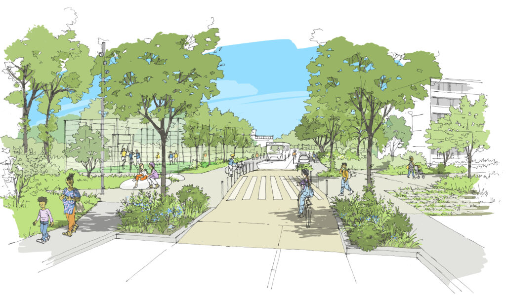 Après la réalisation du square J. Baker, « vitrine » du PRU, le projet de renouvellement urbain du quartier Dravemont se poursuit avec l’aménagement de l’axe est-ouest : axe des usages de proximité qui complète un axe nord/sud très marqué par la rue Allende, le tramway et la composition architecturale du quartier. Cet axe est/ouest fait le lien entre toutes les composantes du quartier : pavillonnaire et logements collectifs, groupes scolaires, parc et square, station de tram et commerces, équipements culturels et services publics.