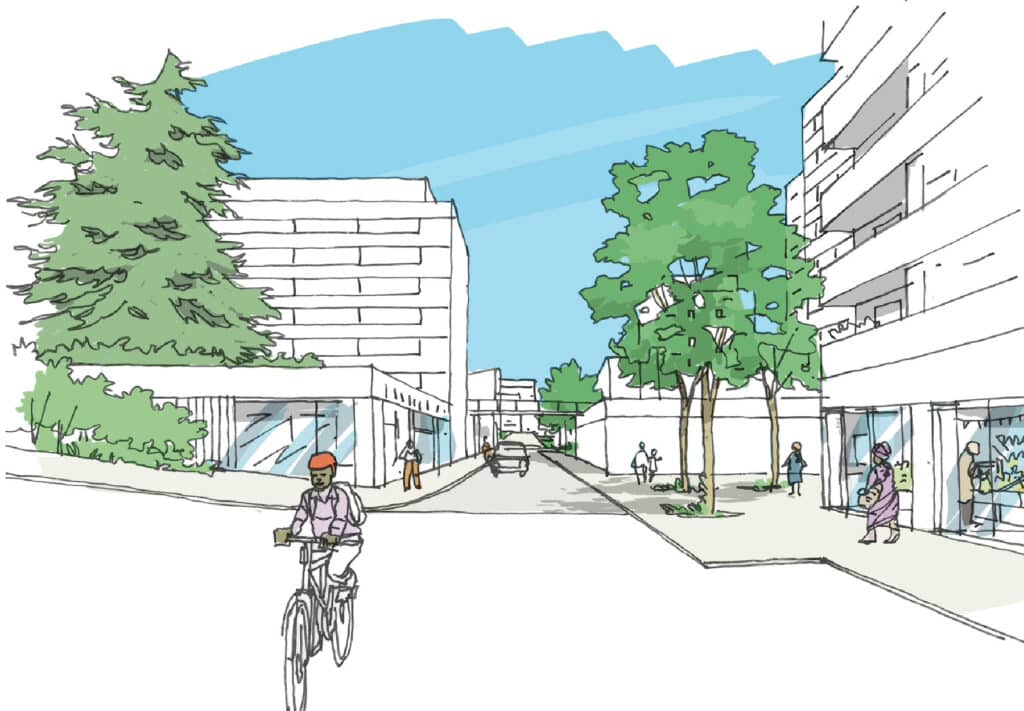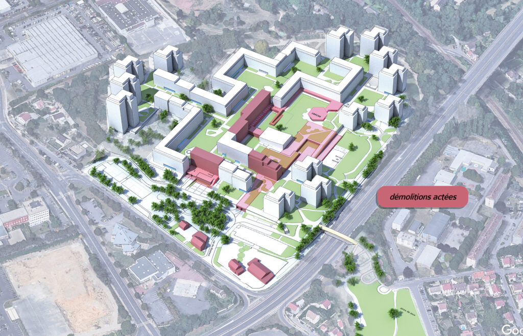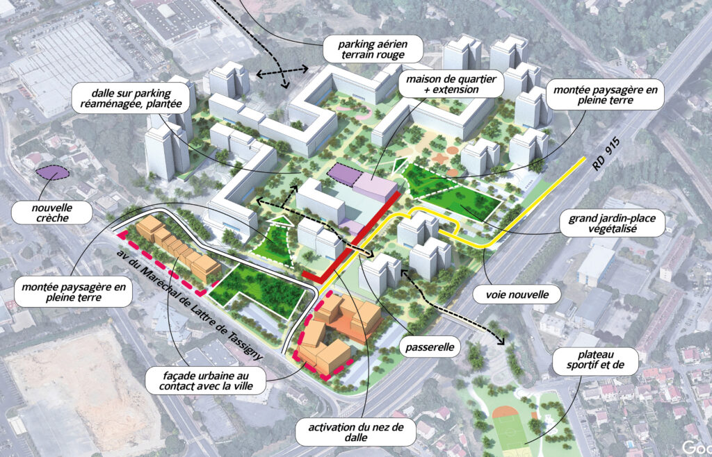 – ouvrir le quartier sur l’extérieur et lier les dalles de parking au sol de la ville,