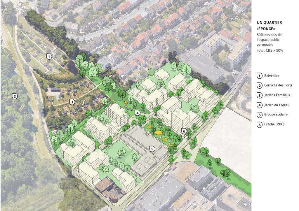 Une stratégie d’infiltration : associer les espaces publics existants à la nouvelle trame paysagère.